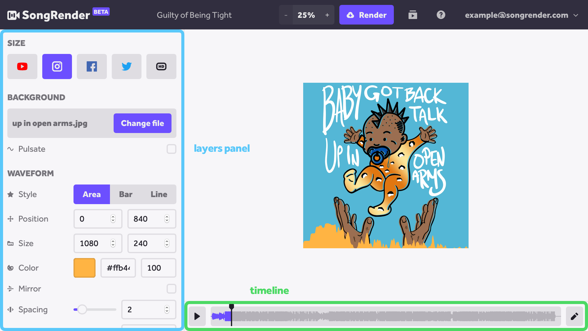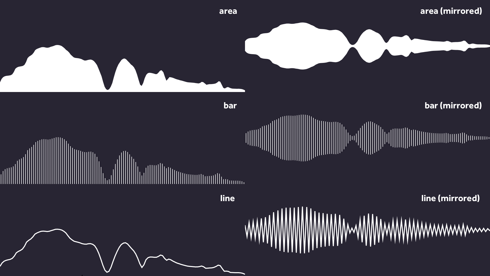 In the layers panel, there’s another section labeled “waveform”. There are three main styles of waveform: bar, line and area. Try them out and see which one you like best! You can also uncheck the box that says “mirror” to make the waveform flat at the bottom.